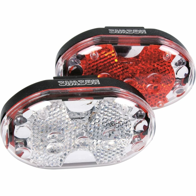 Simson Batterij verlichting set met een 5 led?s voor- en achterlicht. Klik de lampjes eenvoudig vast aan een riem of monteer deze met behulp van een kruiskopschroevendraaier en de meegeleverde bevestigingsring op de zadelpen en het stuur. Het fietslampje kan vervolgens eenvoudig in en uit de bevestigingsring worden geklikt. Inclusief 4 x AAA batterijen.
